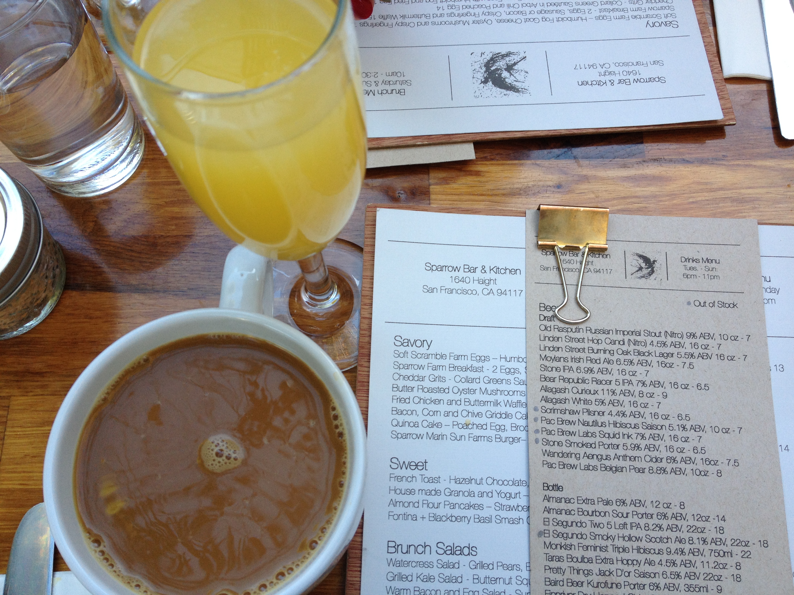 During my recent Christmas trip to San Fran, my mom and I ventured to the Haight for some shopping and brunching. First stop was to Buyer’s Best Friend – an incredible foodie market which left my taste buds dancing with delight. If you have the chance to stop by their store, make sure to sample, well, everything. I walked away with some amazing basil olive oil, jalapeño garlic olive oil, orange blossom balsamic vinegar and the most amazing kale chips of all time. After multiple samplings, we were told to go visit Brendan at the Sparrow Bar and Kitchen, and he would make sure we had a delicious lunch. And so begins our lunching tale.