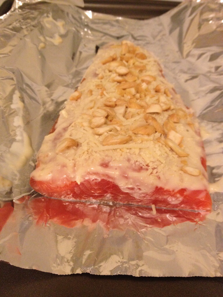 Fold the tin foil over the salmon to create a pouch, then bake for 5-7 min. Unfold the foil and let the salmon continue to bake for another 3-4 minutes, allowing the cheese and almonds to crisp.