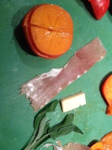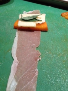 Halve the persimmon and slice into 1/4 inch thick slices. Lay the persimmon, manchego and sage leaf on top of a slice of prosciutto. Roll the prosciutto and place on a baking sheet.