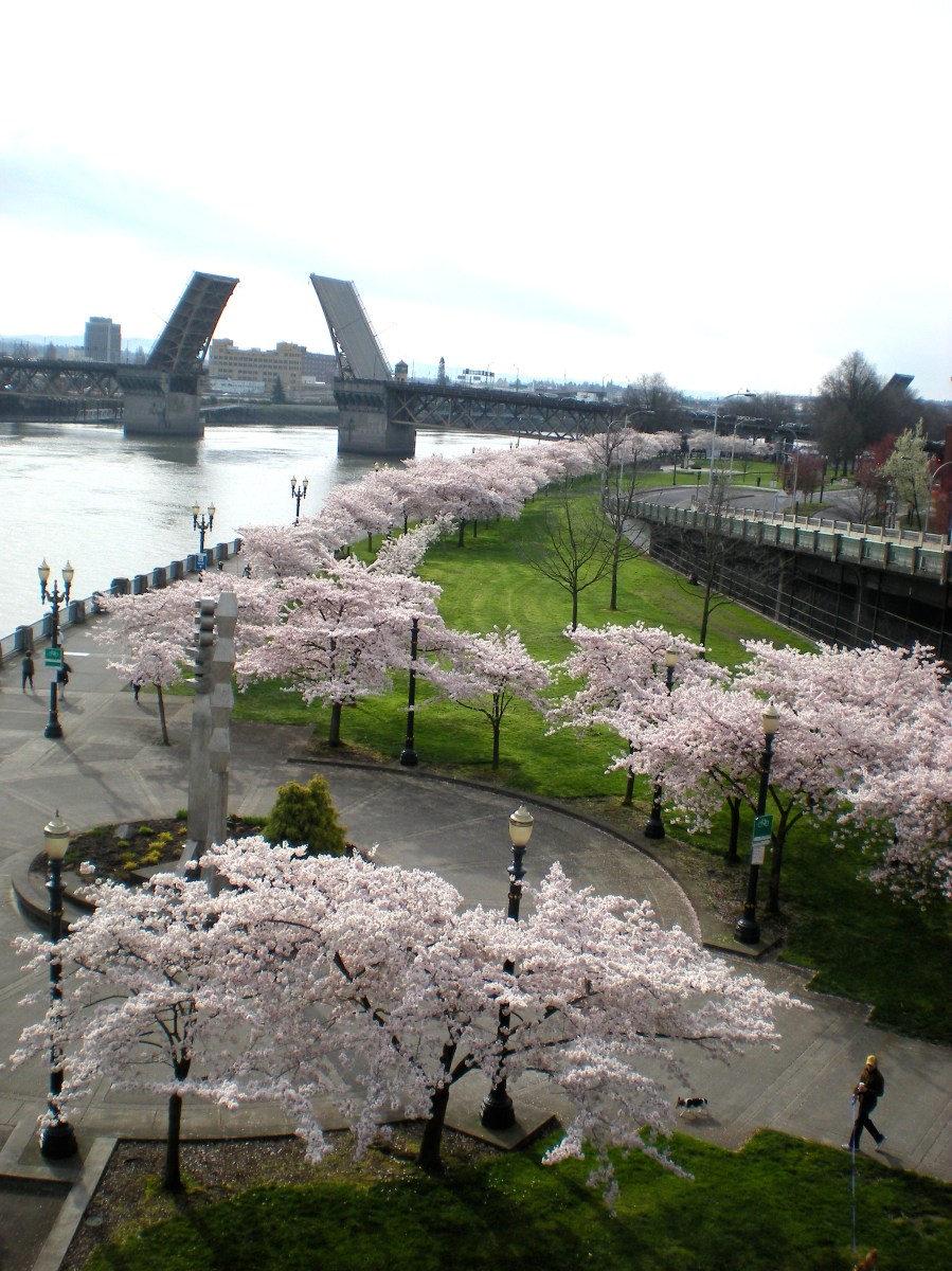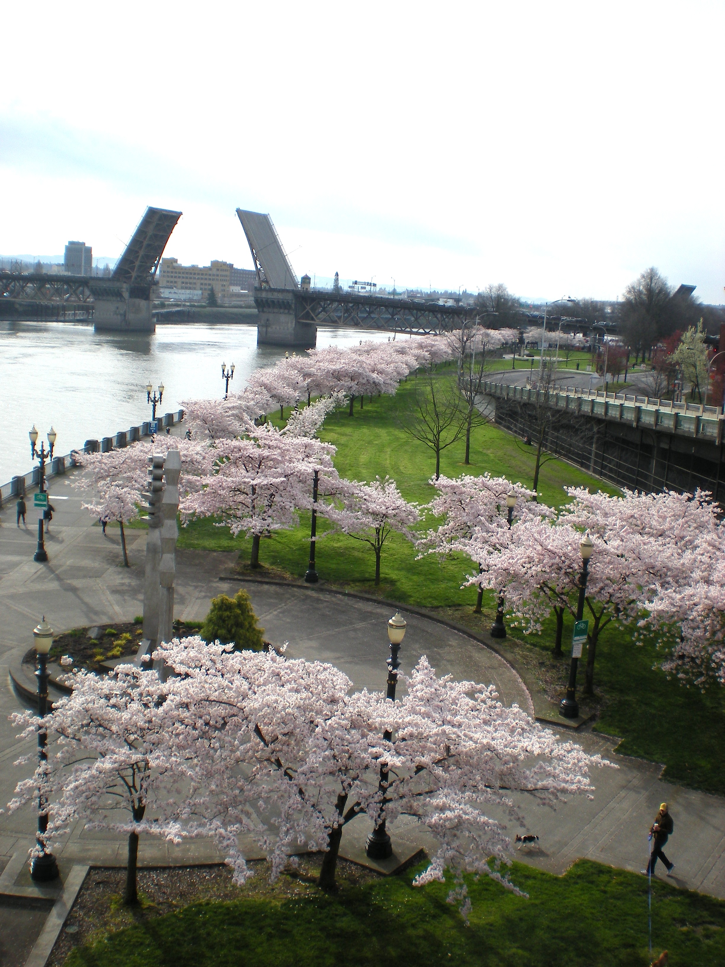 Peering down the Waterfront toward the drawn Burnside Bridge.