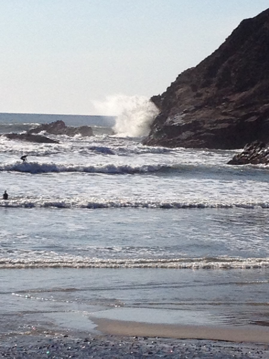Surfers brave the currents while waves crash against the adjacent cliffs.