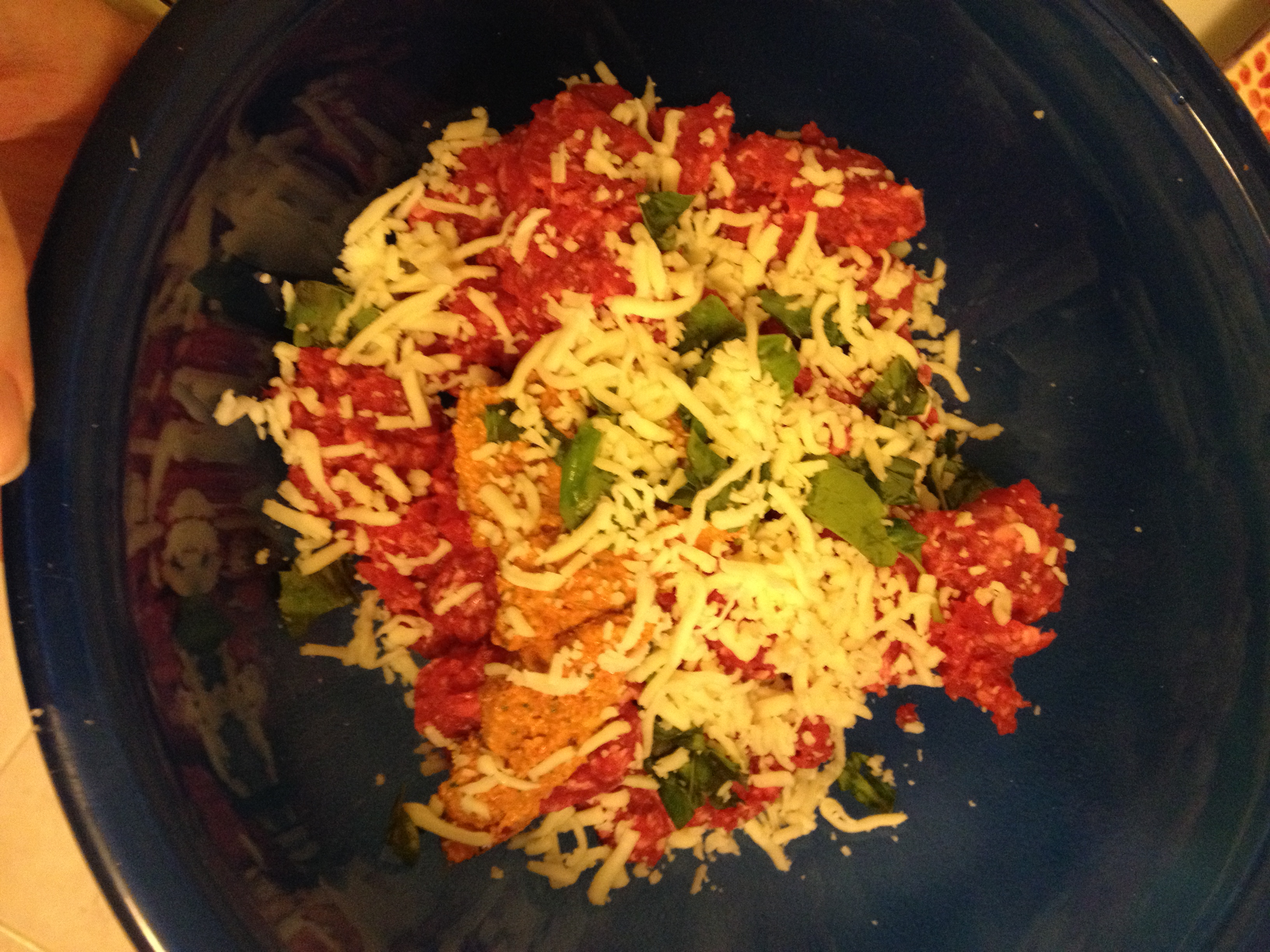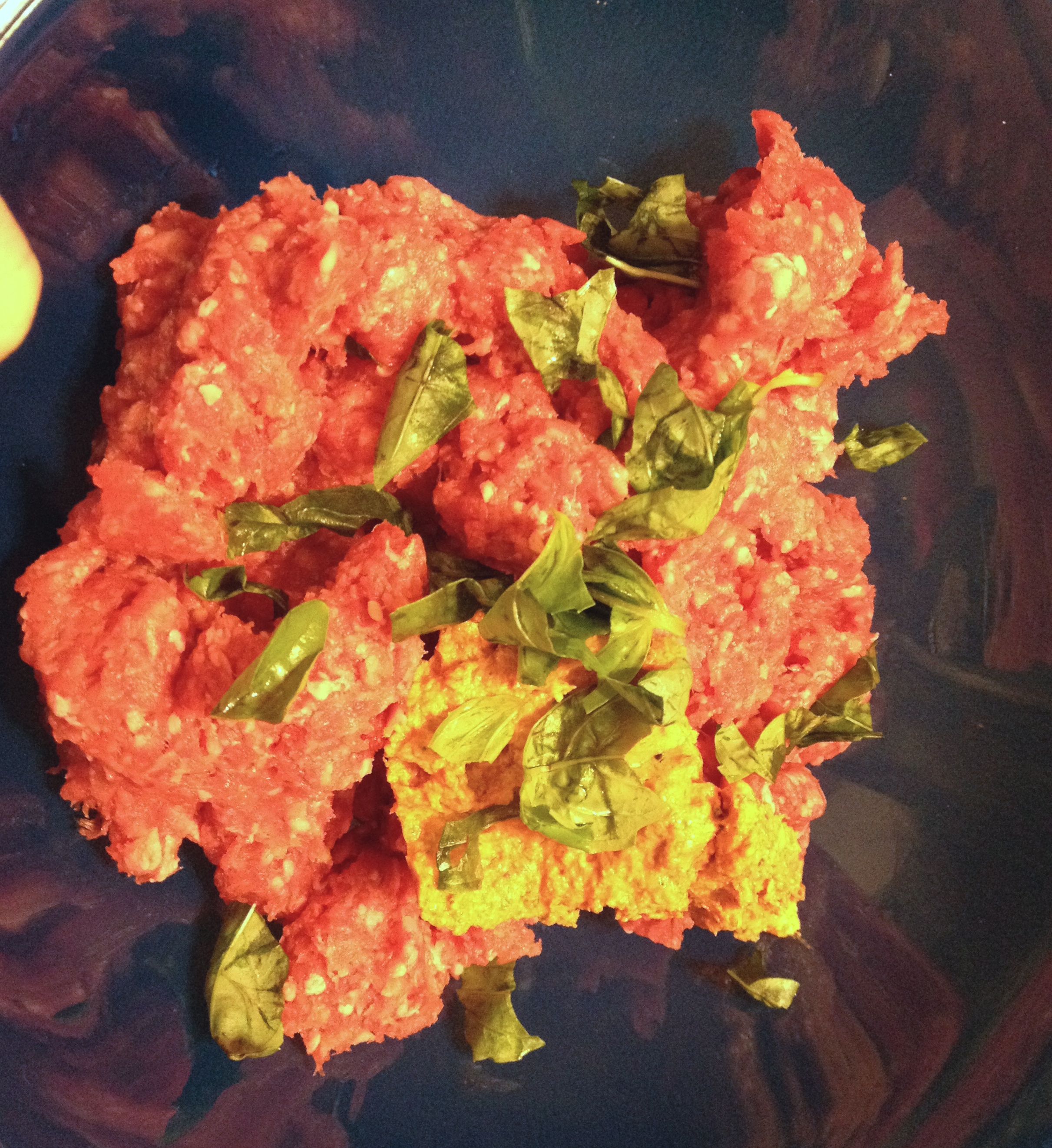 I used the same feta pesto that I created for the Pesto and Sausage-Stuffed Chicken, which consists of sundried tomatoes, basil, olive oil, garlic, pine nuts and feta. Throw it all in a food processor (seriously, how did I manage with only a blender for so many years?!), and then you’re ready to add to the ground beef. In a bowl, combine the beef, mozzarella, pesto, basil and egg until well mixed.