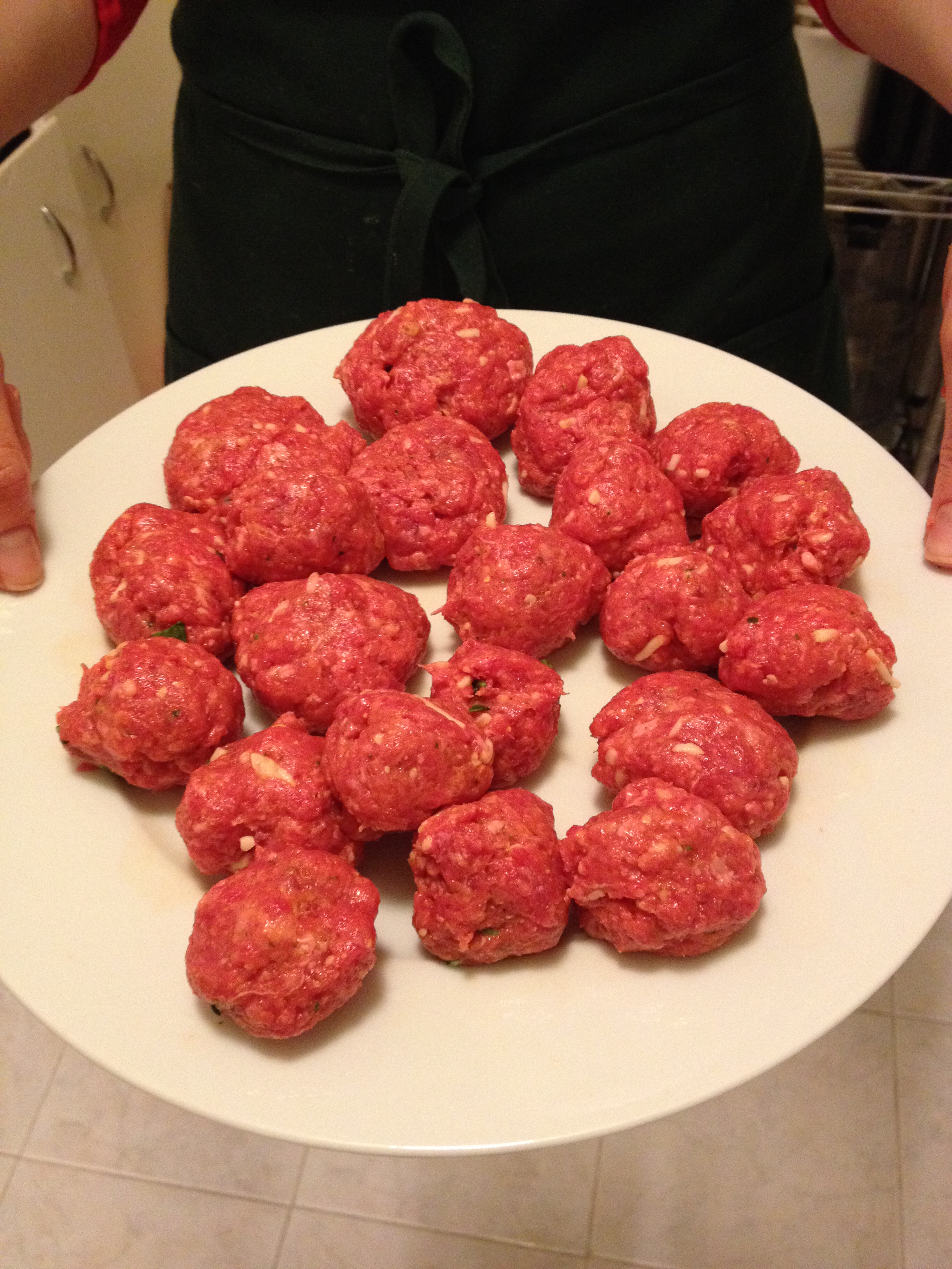 Over medium heat, add olive oil to a frying pan, and shape the meat into your preferred sized ball (ok, fine, get the snickering out of your system already). Place the meatballs evenly on the pan, and let cook until the inside is still slightly on the rare side. Remove from heat.