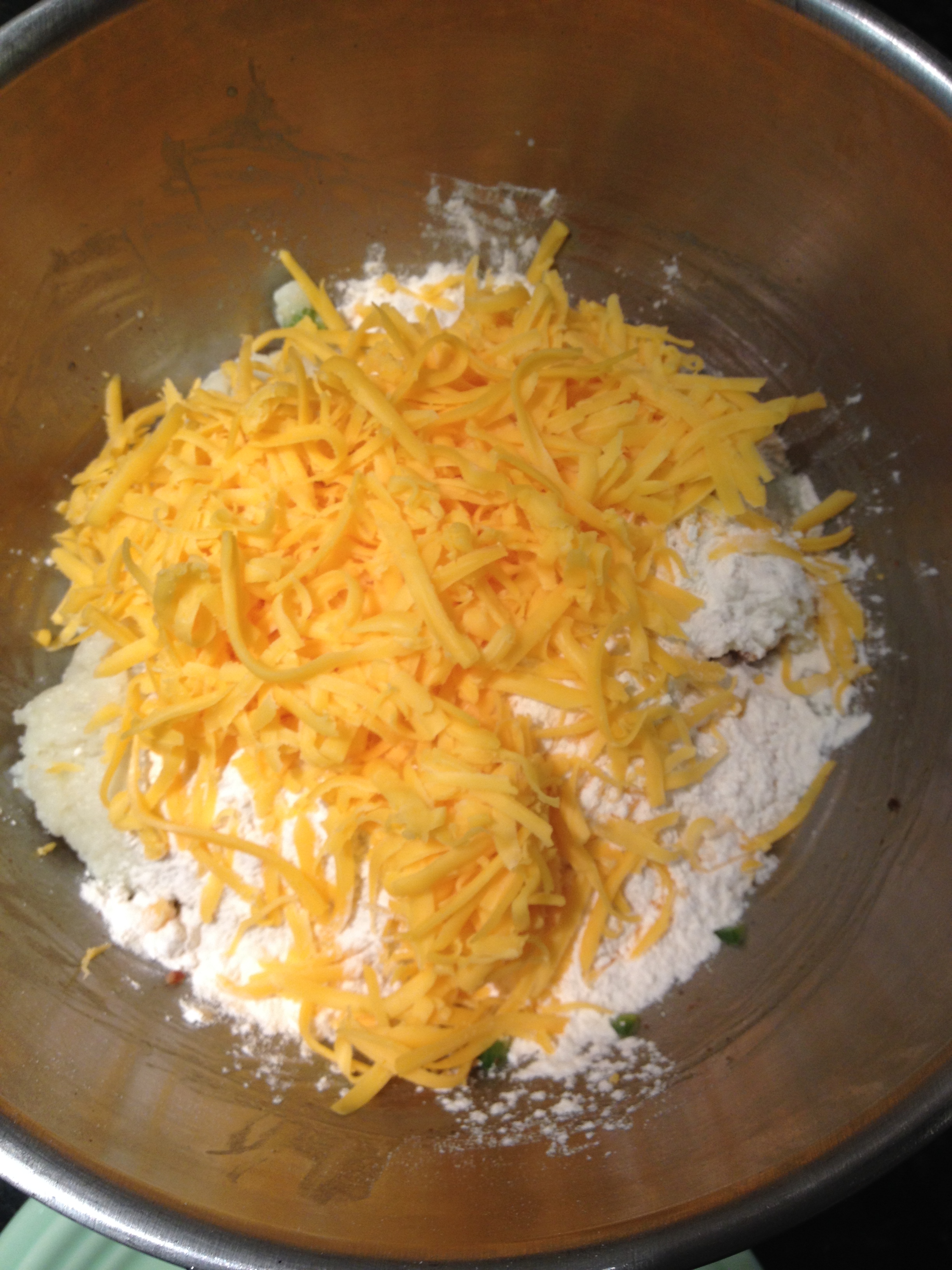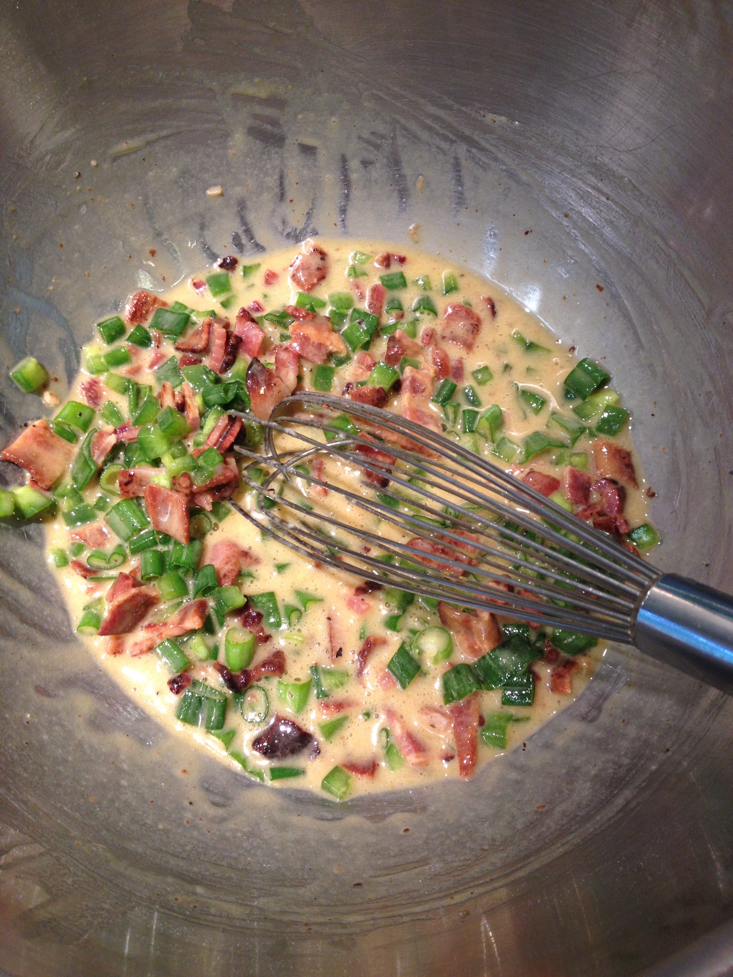 - Meanwhile in a small bowl whisk together the eggs, bacon, scallions, jalapeno, 2 tablespoons of the flour and a pinch each of salt and pepper.