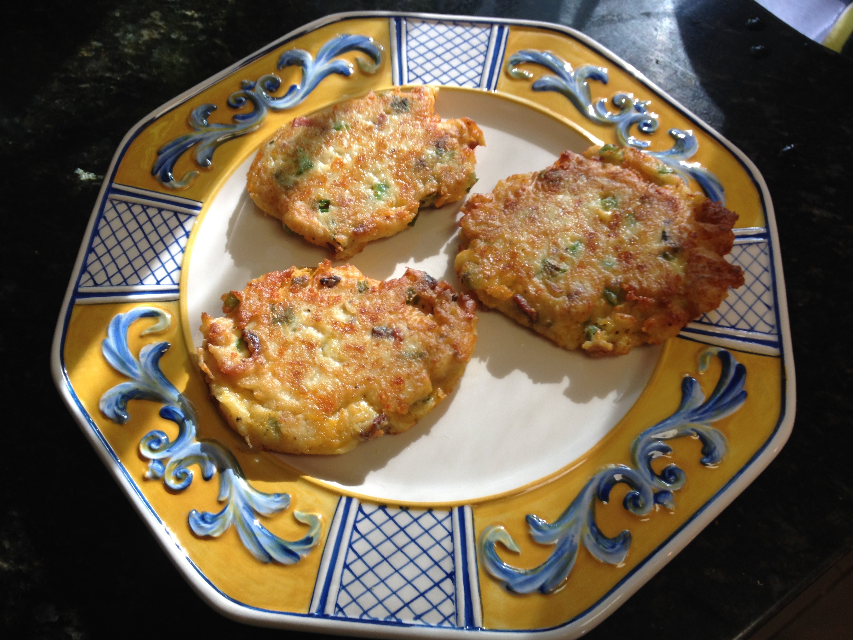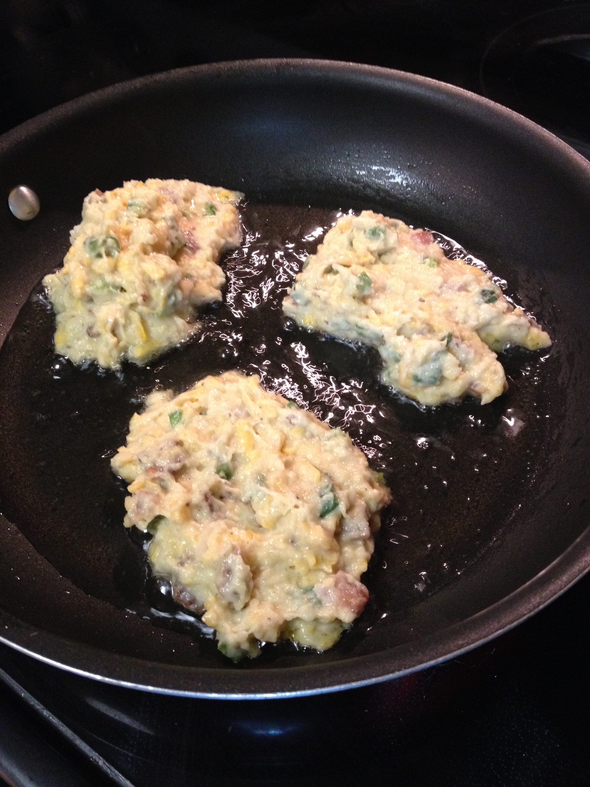 - Cover the bottom of a large nonstick skillet generously with oil and heat over medium heat. Drop rounded tablespoonfuls of batter into the skillet, flatten slightly and cook until golden brown, flip and cook until golden brown on the other side. Remove to paper towels to drain.