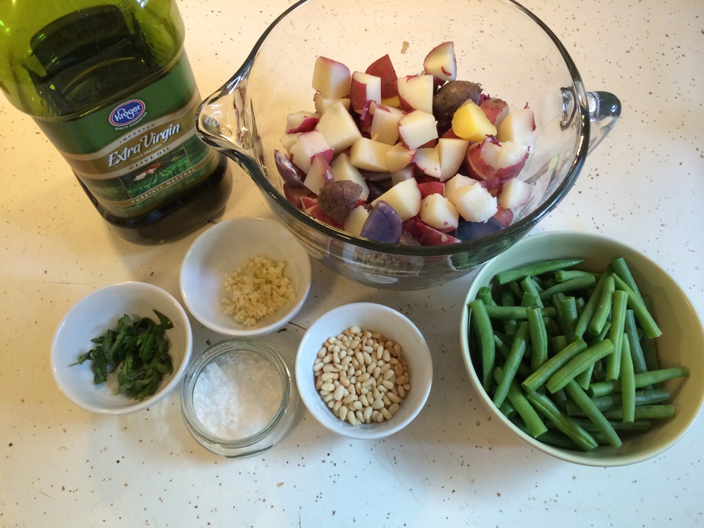 I recommend smaller tri-color potatoes, like the red, yellow and purple ones that come prepackaged from Trader Joe’s (don’t use the golden butterballs, though, found out the hard way that they are not nearly as durable). Fresh green beans from the garden or the farmers market are a great way to add color, crunch and interest, but can also be left out.