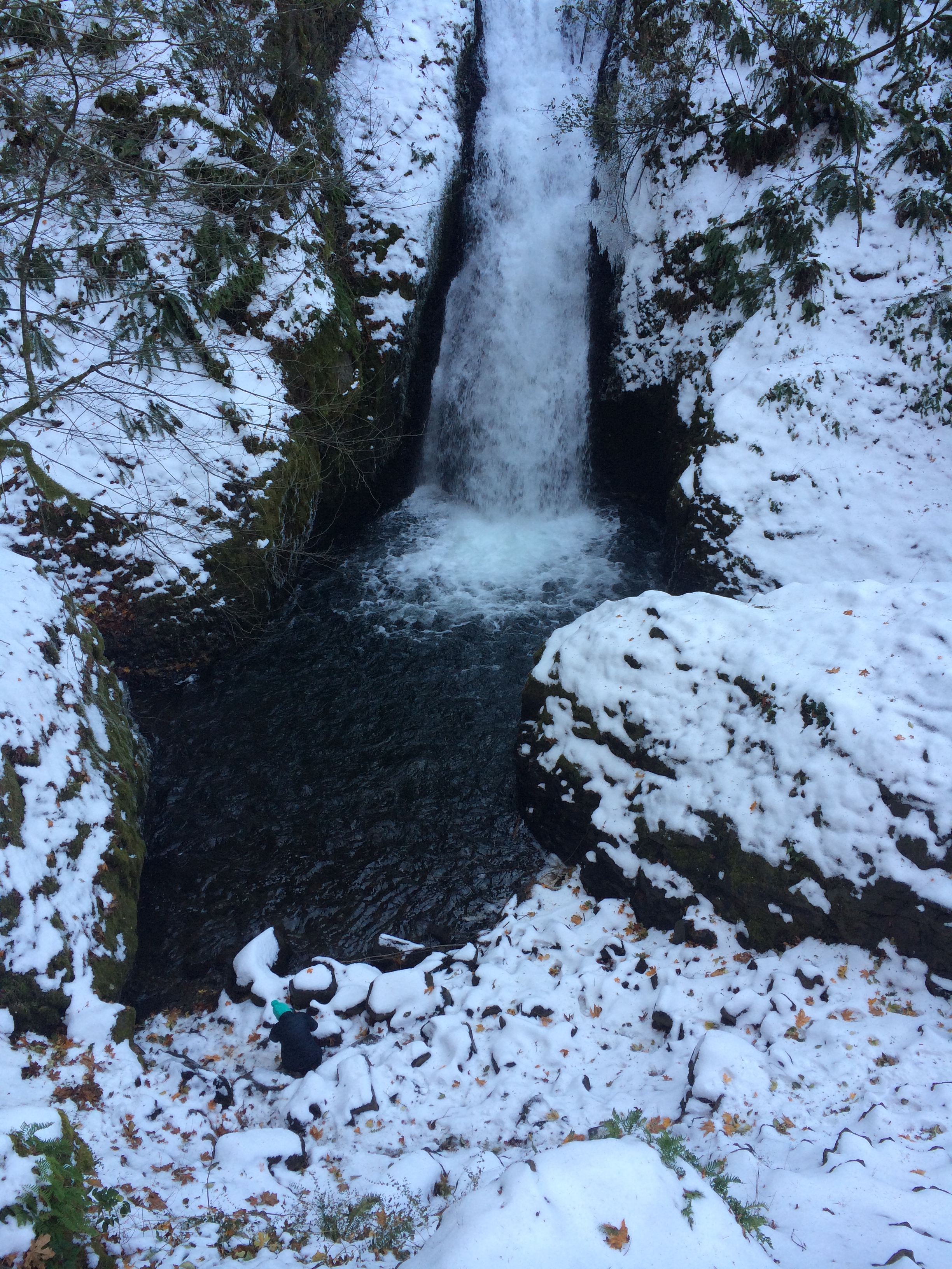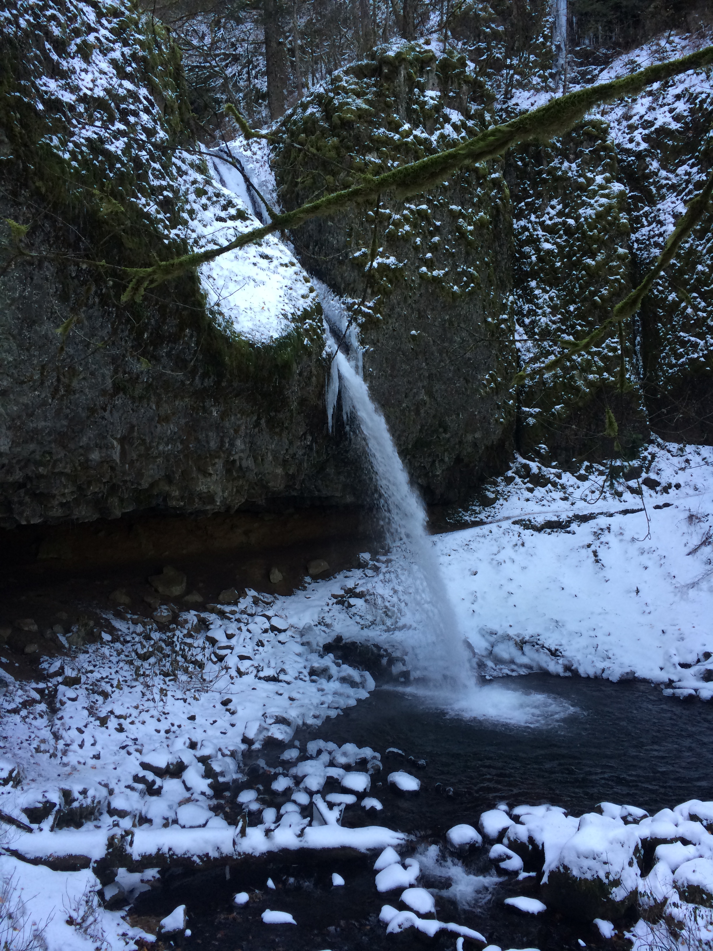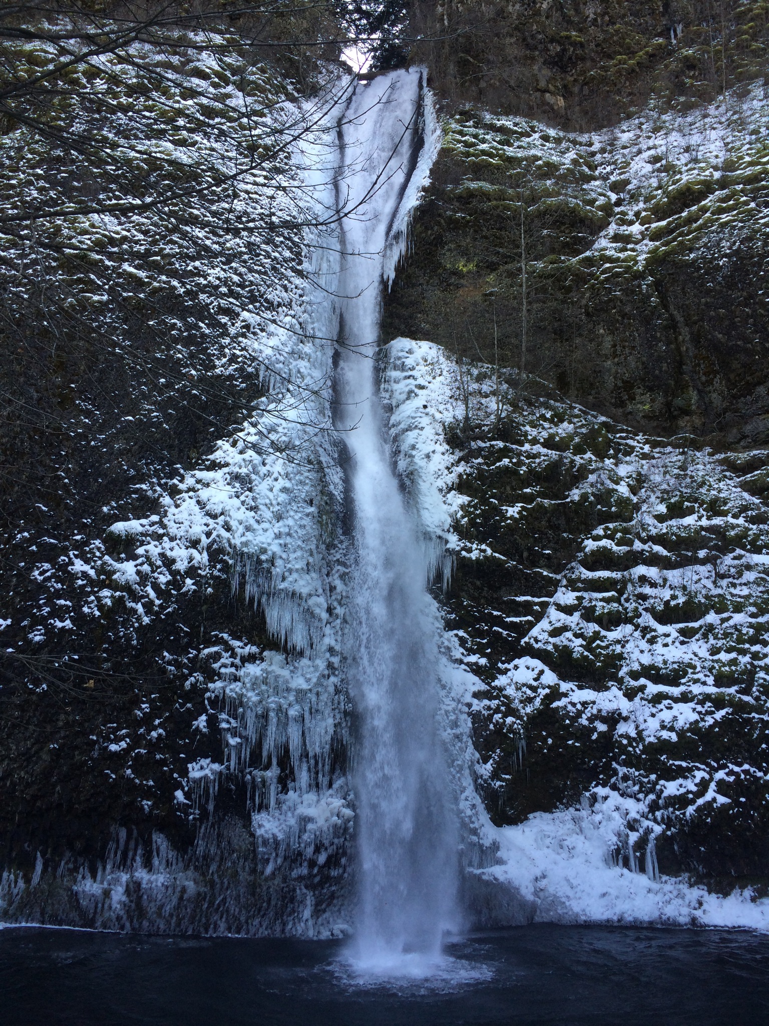 The whole trail is a whopping .6 miles down and back, so it’s a great way to start your frozen waterfall ramp up. Unlike most of the waterfalls in the Gorge, this one is below you, so the cramp-ons are particularly useful. As you descend, you’ll have an open view of the Columbia River, and then down to a bubbling brook. The falls are on the opposite side of the bridge and to your right (you’ll hear it). Hike up to the crow’s nest for a complete view, or walk down to the pool for a fresh splash of ice water misting on your face.