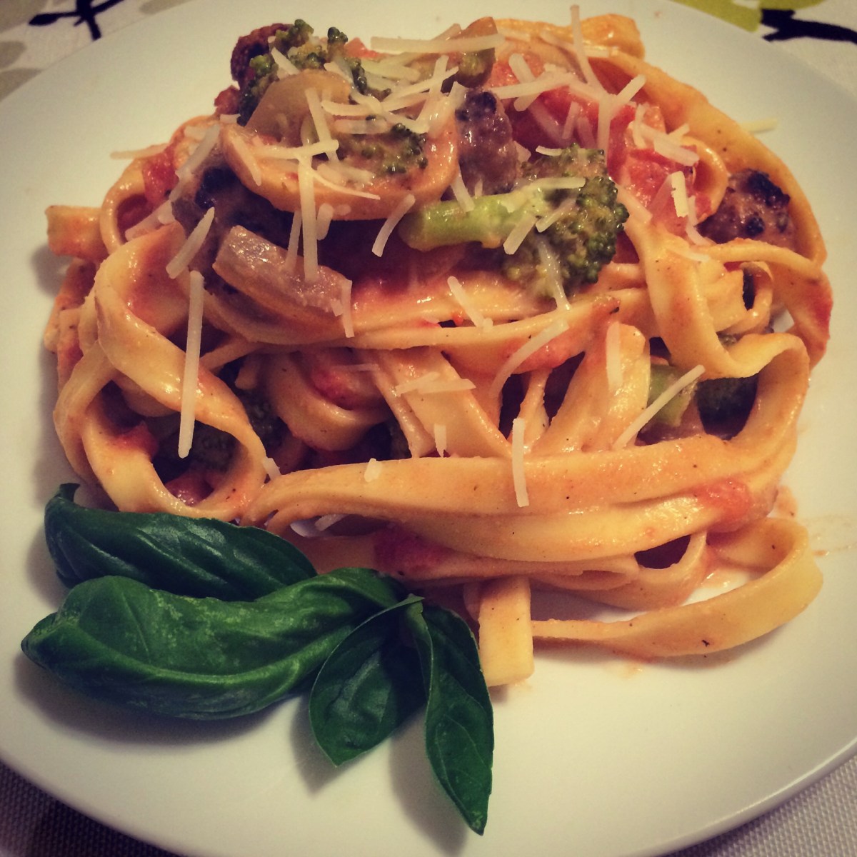 Sausage and Veggie pasta in creamy tomato vodka cream sauce