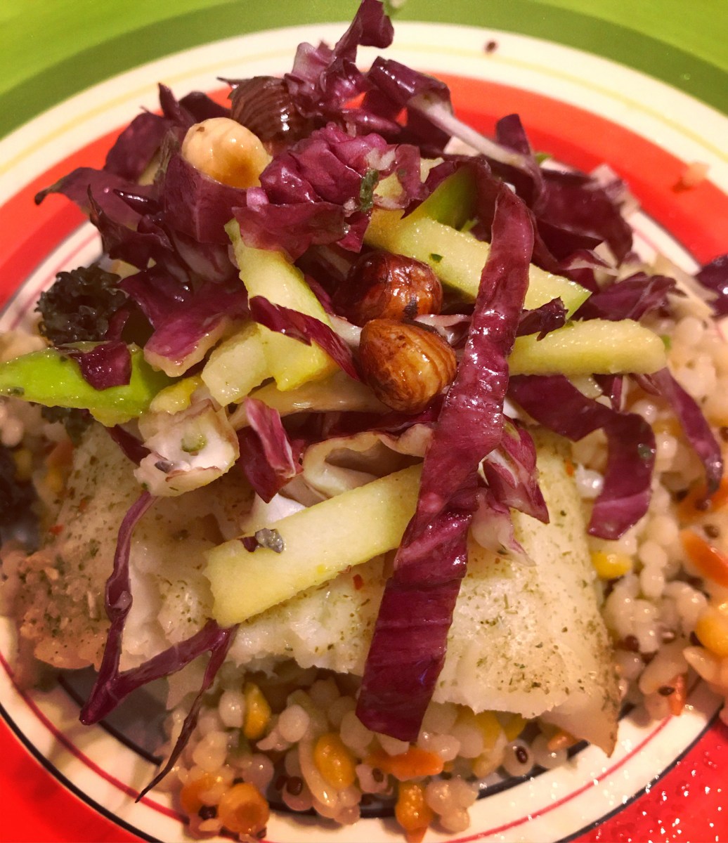 6c1f5013-2c39-47ca-a34d-5651c1172197 Tilapia, couscous, and radicchio salad with rosemary anchovy sauce