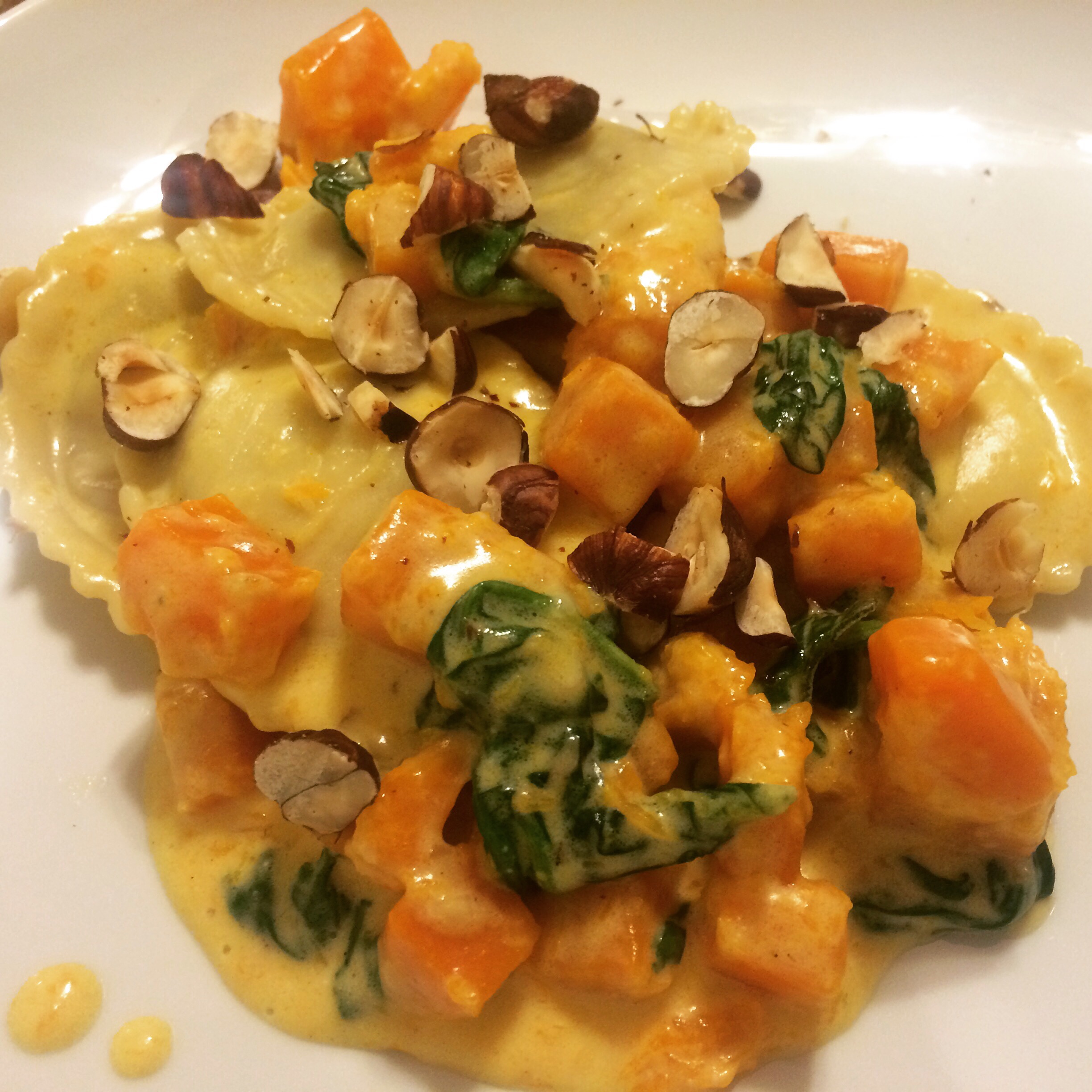 Mushroom ravioli with roasted butternut squash, hazelnuts and spinach in a cream sauce